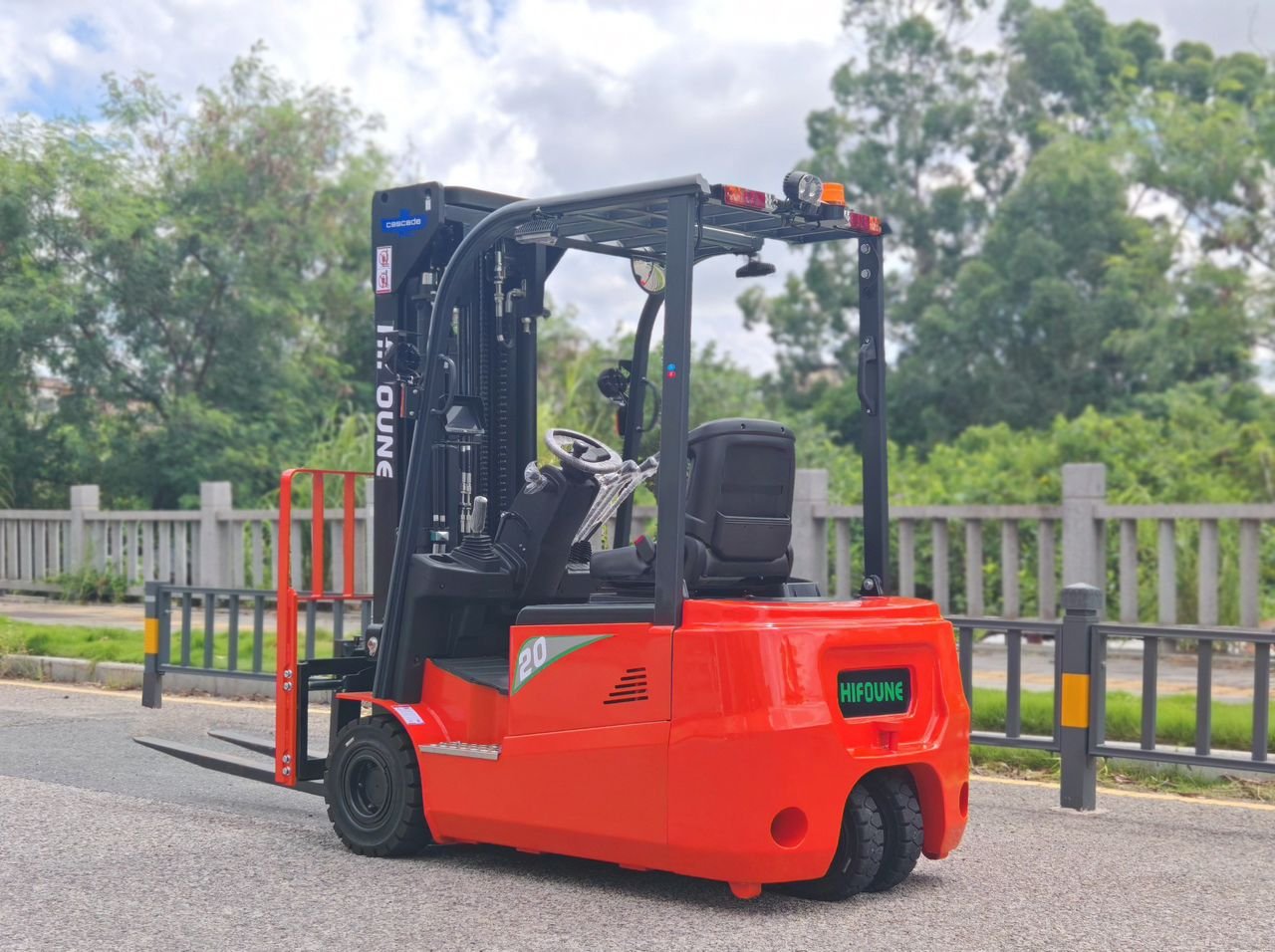 Marca: HIFOUNE - Capacidad nominal: 2000 kg Capacidad de carga real a la altura máxima de elevación: 1350 kg Motor de CA para desplazamiento y trabajo; Batería de litio (48 V/404 Ah); Mástil de 6 metros de longitud y 4 etapas (marca Cascade); Desplazador lateral y posicionamiento de horquillas; 4 válvulas; Neumáticos; Asiento semicerrado y cómodo; Horquillas de 1,1 m de longitud; Luces LED de trabajo; Cargador inteligente; Refrigeración por aire